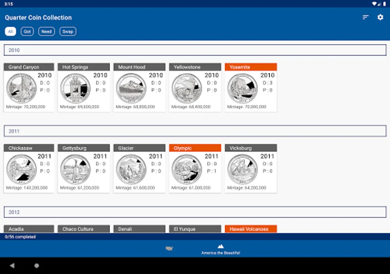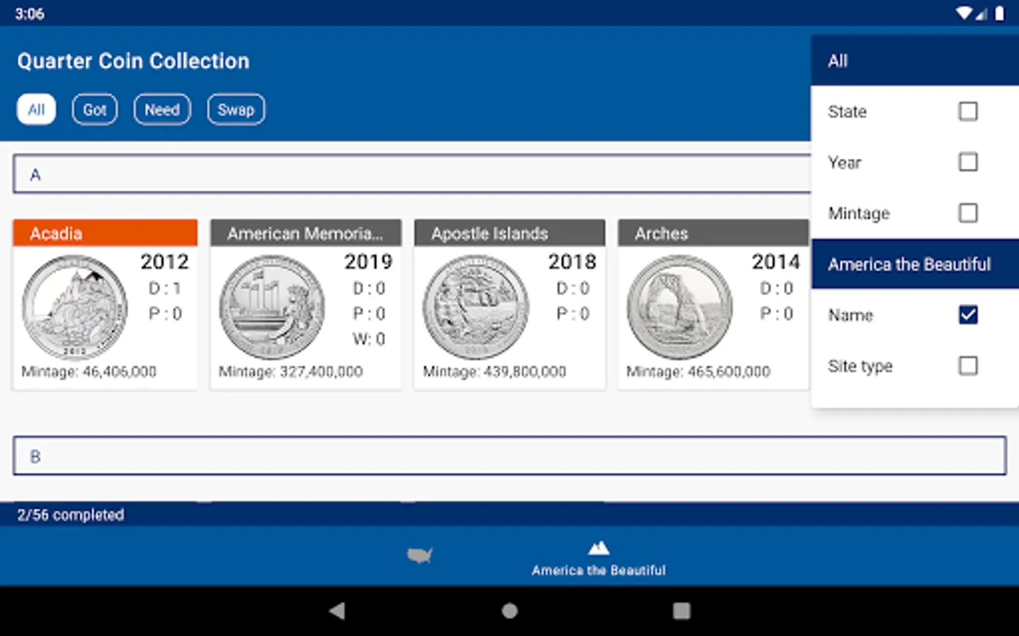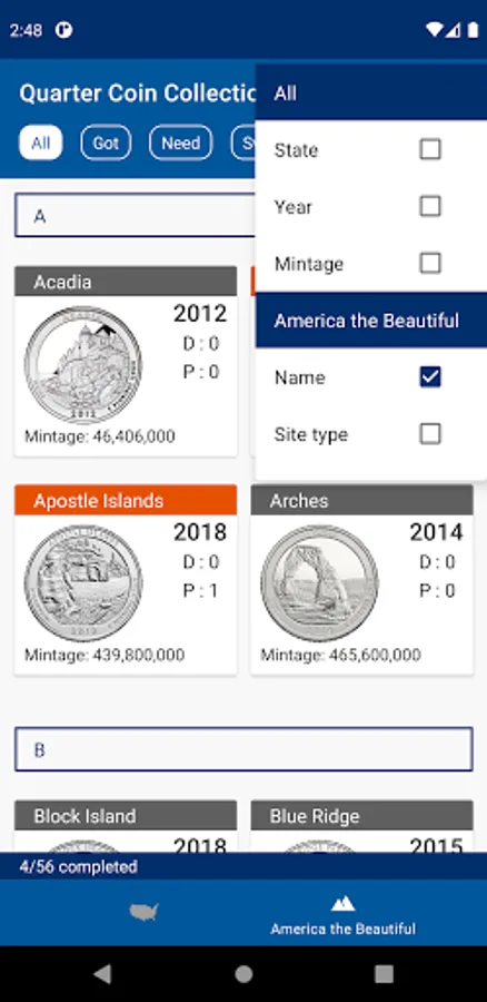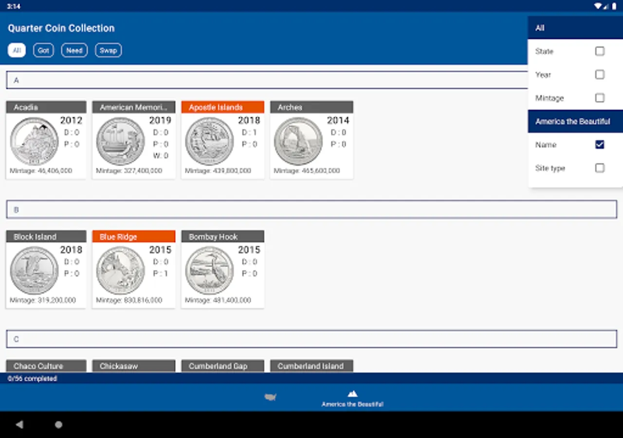 Coins can be sorted by states, date of issue, mintage and for the "America the Beautiful" series by name and type of site they represent.