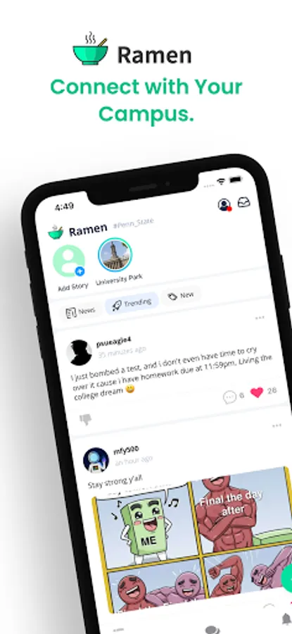 Ramen is a social media app targeted for college students. You sign up with your edu email to get access to your school's board where you can: