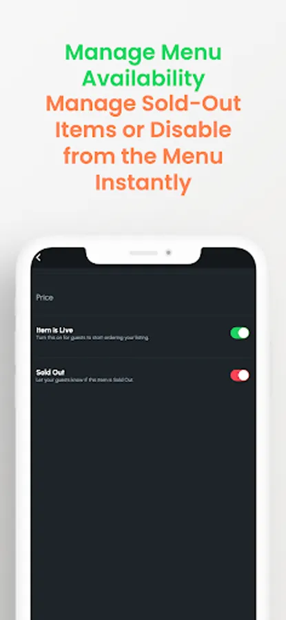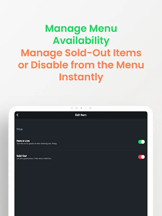 With our app, you have complete control over your menu. Edit names, upload enticing pictures, adjust prices, and effortlessly add new items. Keep your offerings fresh, exciting, and in sync with your customers' evolving tastes. Mark items as "sold out" with a single tap, ensuring your customers have up-to-date information on available choices.