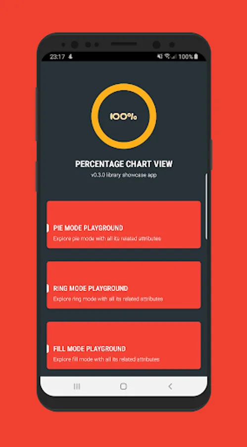 This app showcases my Java-based library called PercentageChartView. It's an easy to use and highly adjustable custom view that displays the progress of a single given task or information.