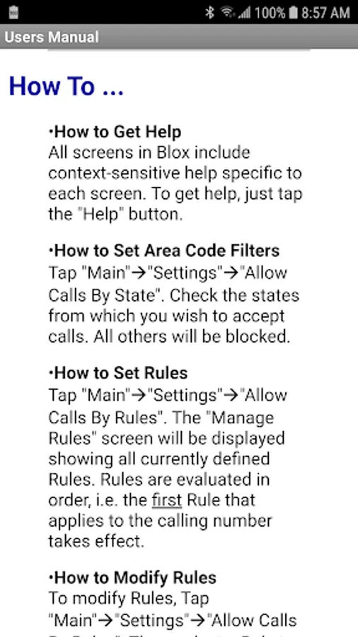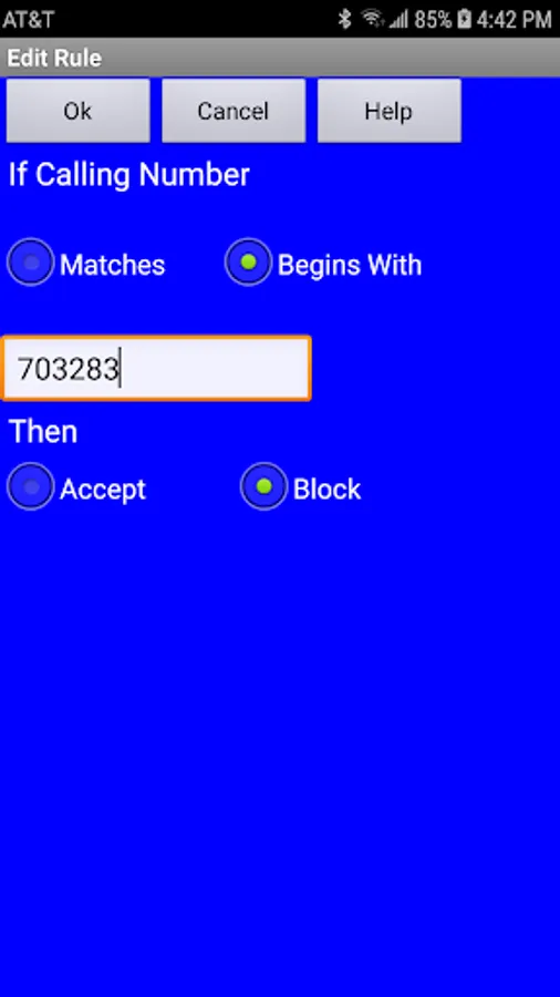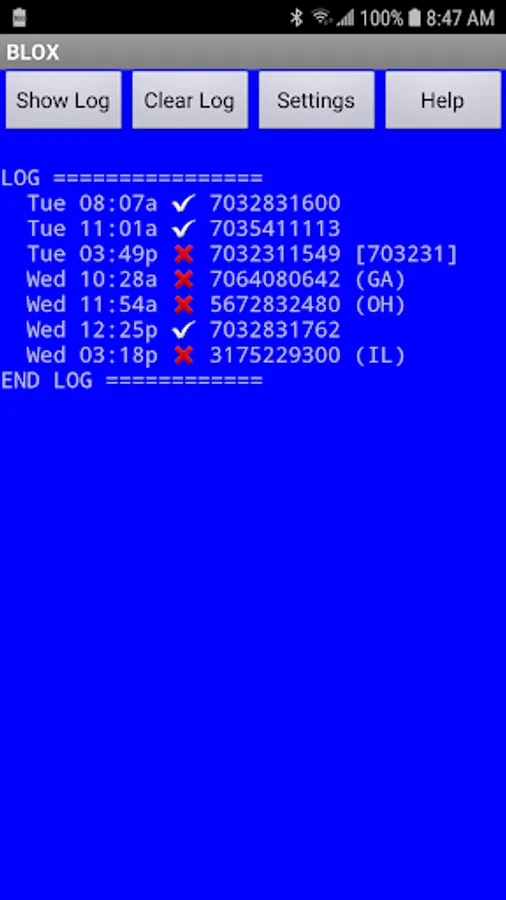 • Blox accepts or blocks incoming calls based on area code or custom rules.