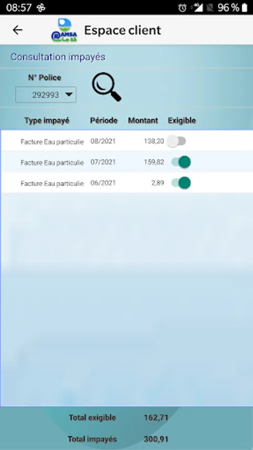 The application allows you to see your unpaid situation, history of your payments and consumption, pay your bills, as you can declare an incident on the drinking water or sanitation network, make a claim on consumption or meter