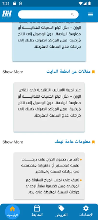 -يحتوي التطبيق على نصائح خاصة بمراحل التغذية بعد عمليات السمنة اذ يمكنك بضغطة واحدة مراجعة