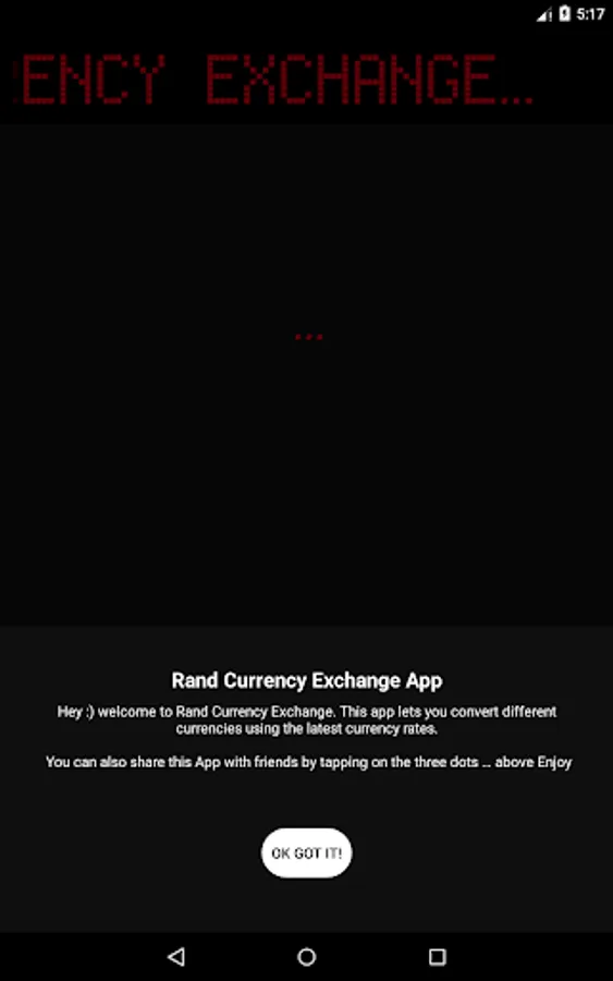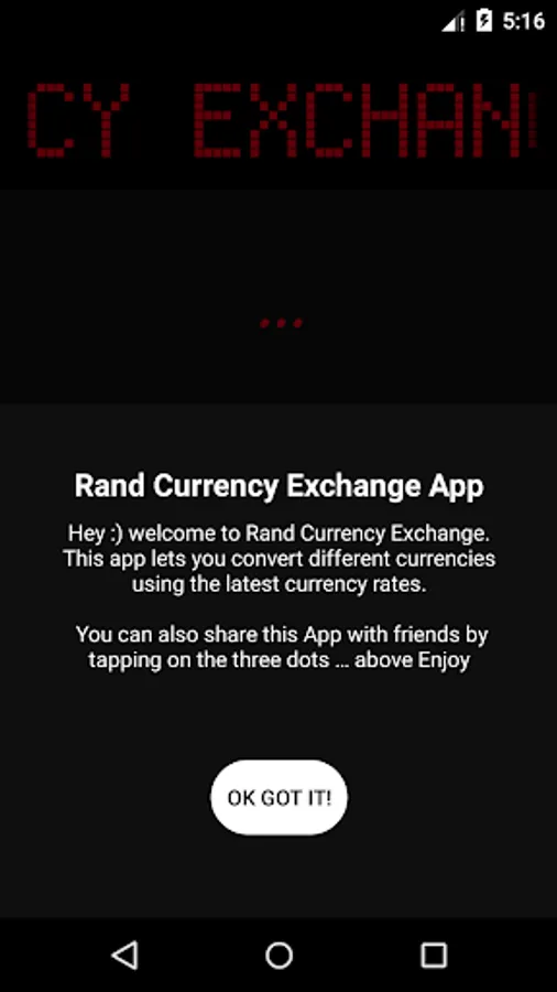 This app lets you convert different currencies using the latest currency rates. Currencies include United States Dollars (USD), South African Rand(ZAR), Zambian Kwacha (ZMW) , Namibian Dollar (NAD), Malawian Kwacha (MWK), British Pound (GBP), Malawian Kwacha (MWK), British Pound (GBP)