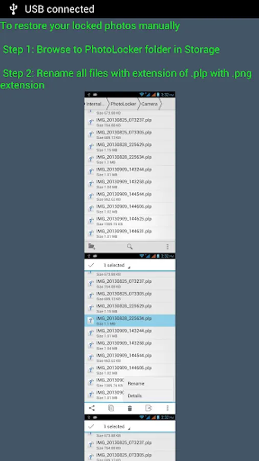 Please Dont Delete PhotoLocker Folder in your phones storage,All your Locked photos are saved here.