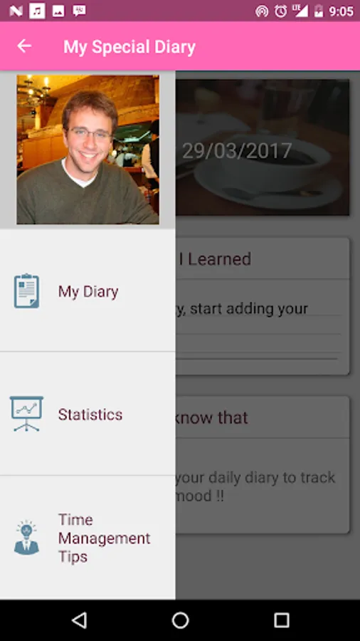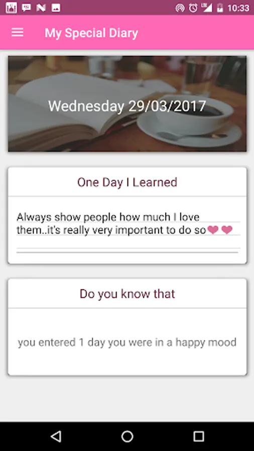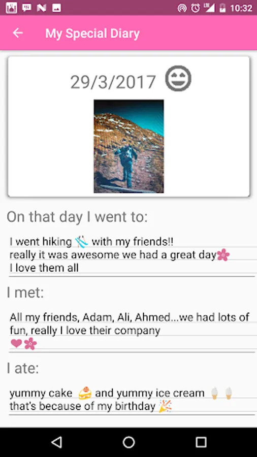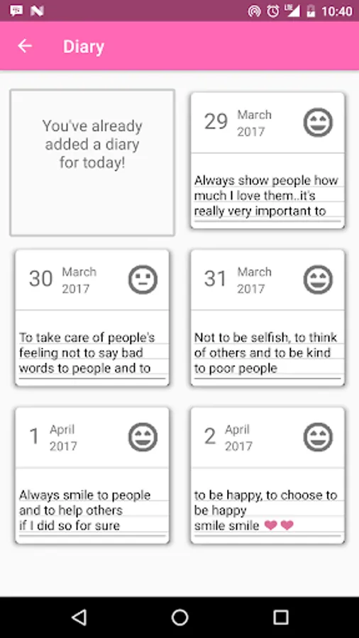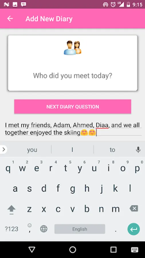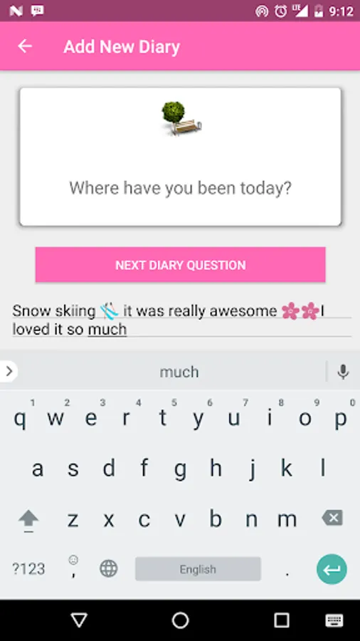 This app helps you to fill your diary by asking you questions about your day and saving the photo the day, It has a daily notification to remind you to add to your diary.