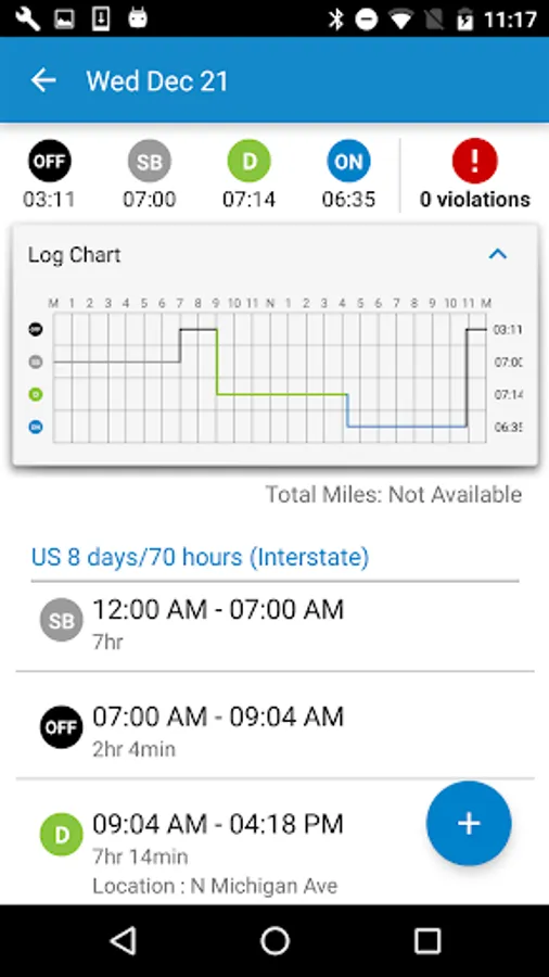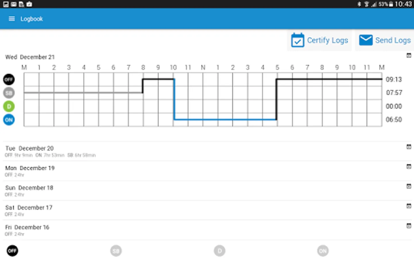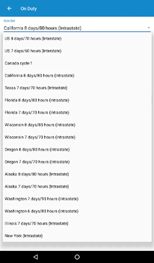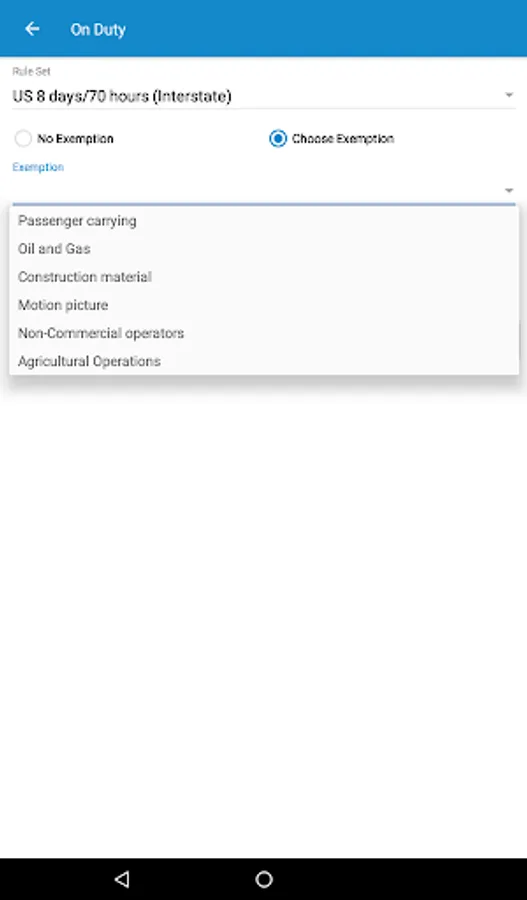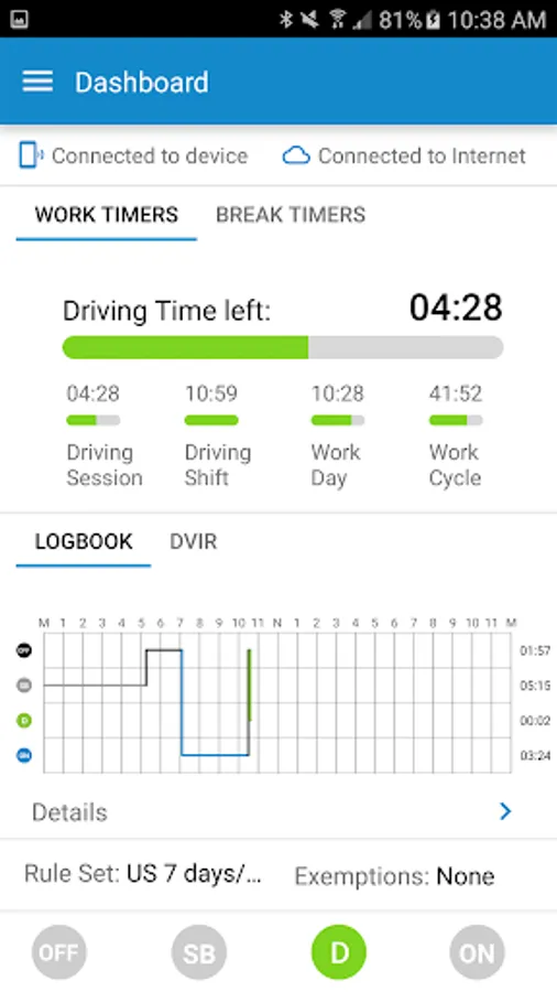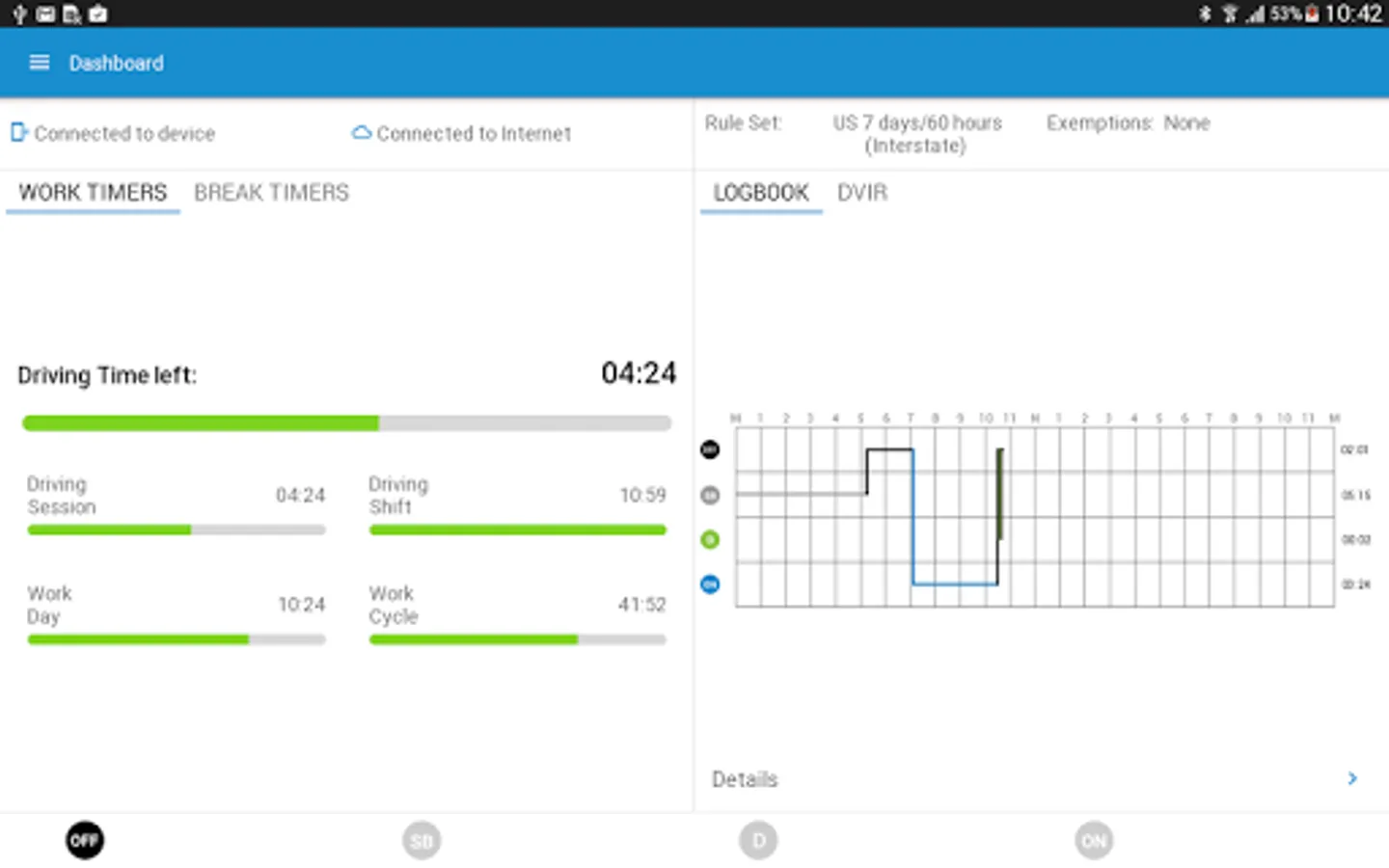 The app allows users to record, view, edit and track On Duty, Driving, Off Duty and Sleeper-Berth duty statuses in a logbook. The app supports US federal and intrastate HOS rule sets: US 8/70, US 7/60, TX, FL, OR, AK, WA, NY, WI, IL. The app also supports Canada cycle-1. Federal exemptions such as passenger carrying, oil and gas, construction material, motion picture, non-CDL drivers and agricultural operations are also supported. The app has provisions to annotate the driving times as personal conveyance and yard moves. HOS Logs from the app can be sent via email to safety officials during inspections.
