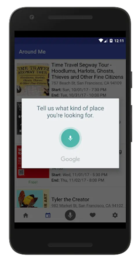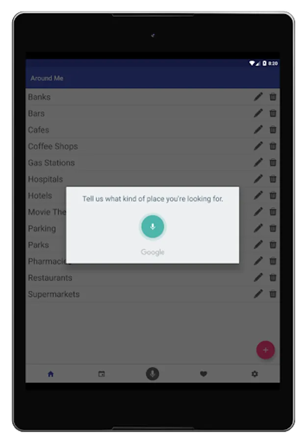 Typing takes too long, so Around Me allows you to quickly search for places with your voice. Just tap the microphone button on the homepage, tell Around Me what you're looking for, and Around Me will quickly return matches near you. Simple as that.