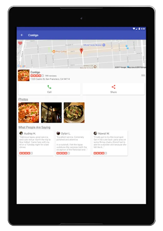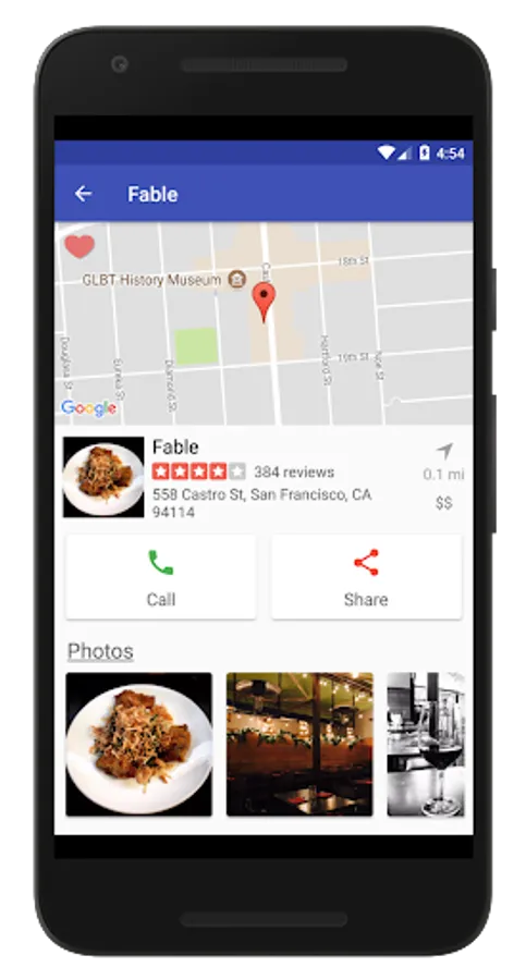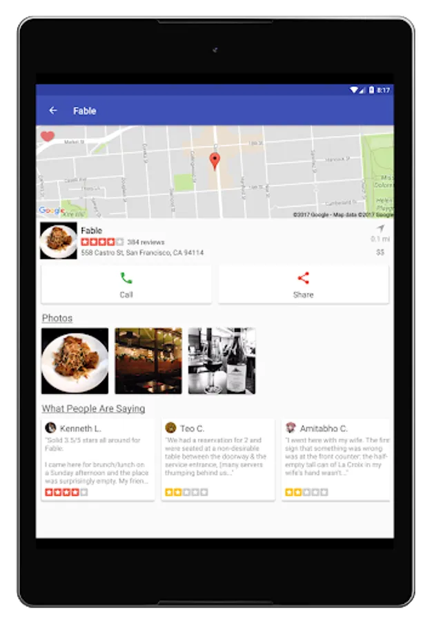 When you click on a place from the search results, Around Me opens it in a detailed full view so you can get the information you need about it. This page shows photos and reviews of the place alongside buttons to quickly call and share it. If everything looks good, you can see where it is on the map and click on that to start heading there in Google Maps!