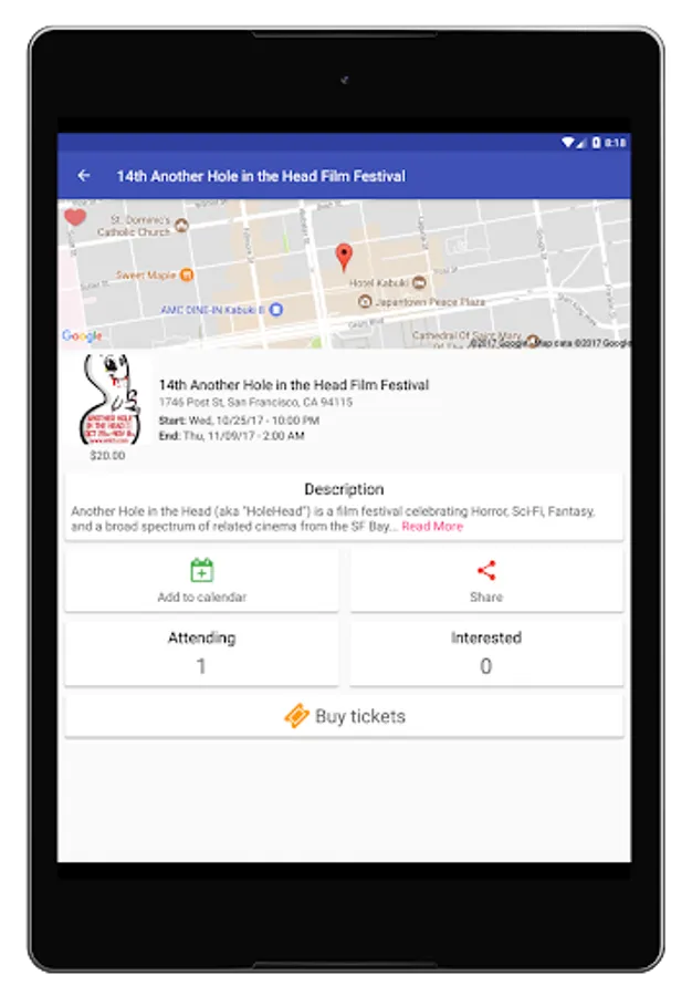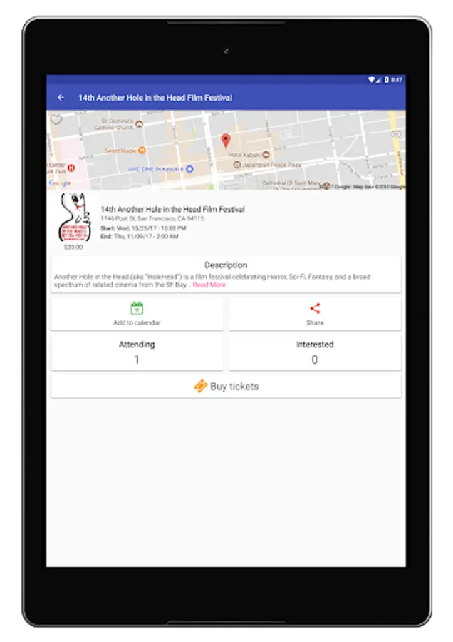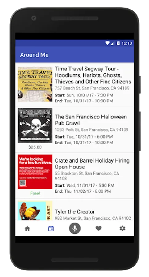 Looking for something to do? Around Me can help with that too! Simply tap on the calendar icon on the homepage, and Around Me will search for events near you! Around Me tells you the address, start time, end time, and cost of each event alongside the number of people who are interested or attending. Around Me also provides buttons to start navigating to the event via your favorite map/transportation app, add it to your calendar, share it, and purchase tickets for it.
