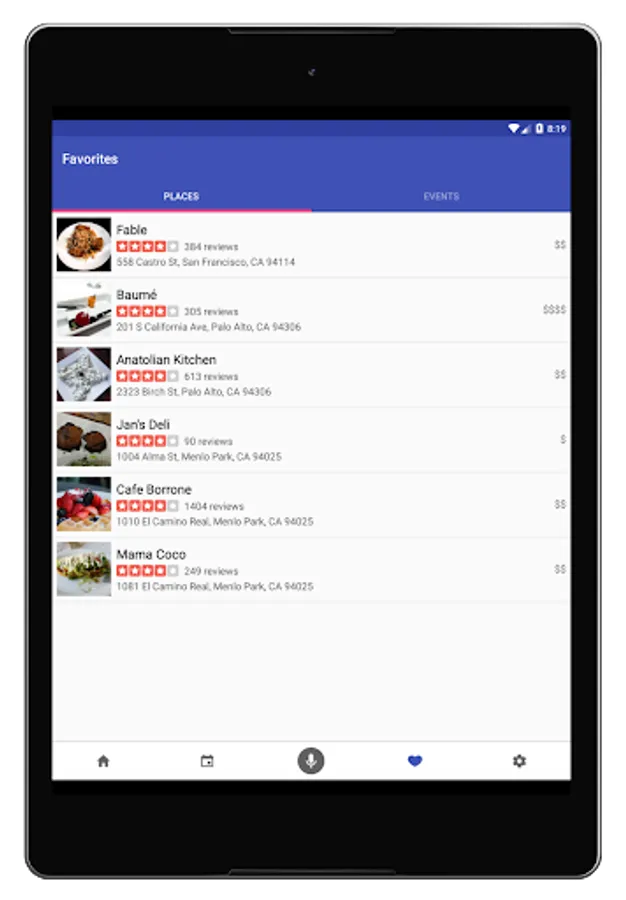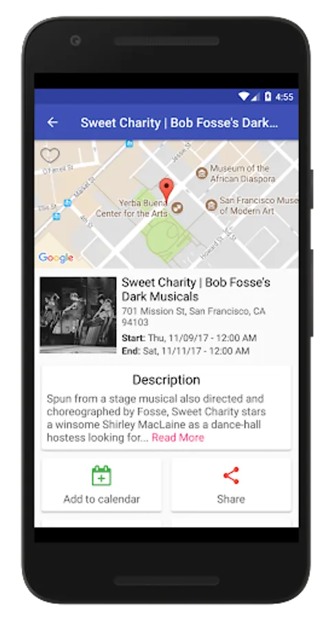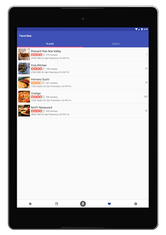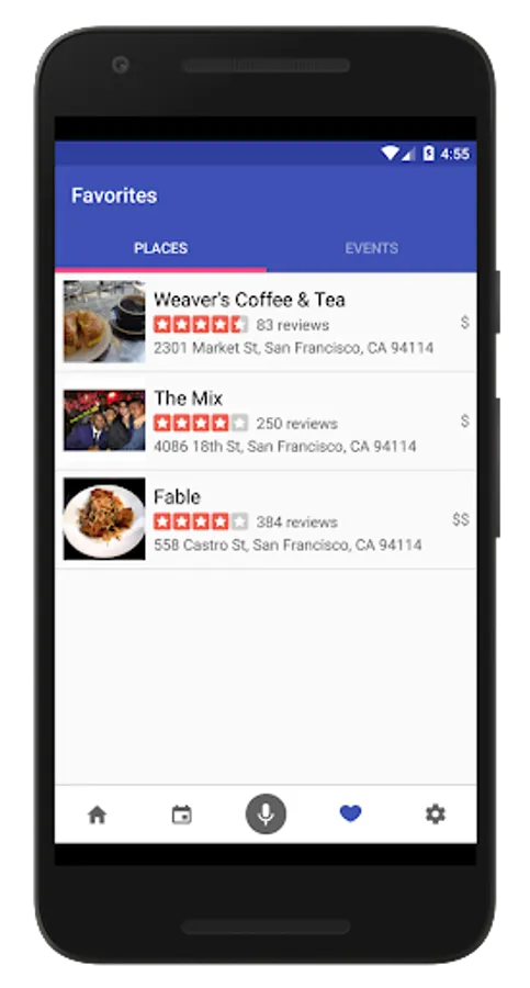 Found a place or event that you really like or want to save for later? Click the heart in the top left of any place or event view to save it to your favorites! Favorites are split up by places and events, and you can unfavorite anything whenever you want by just clicking the heart again!