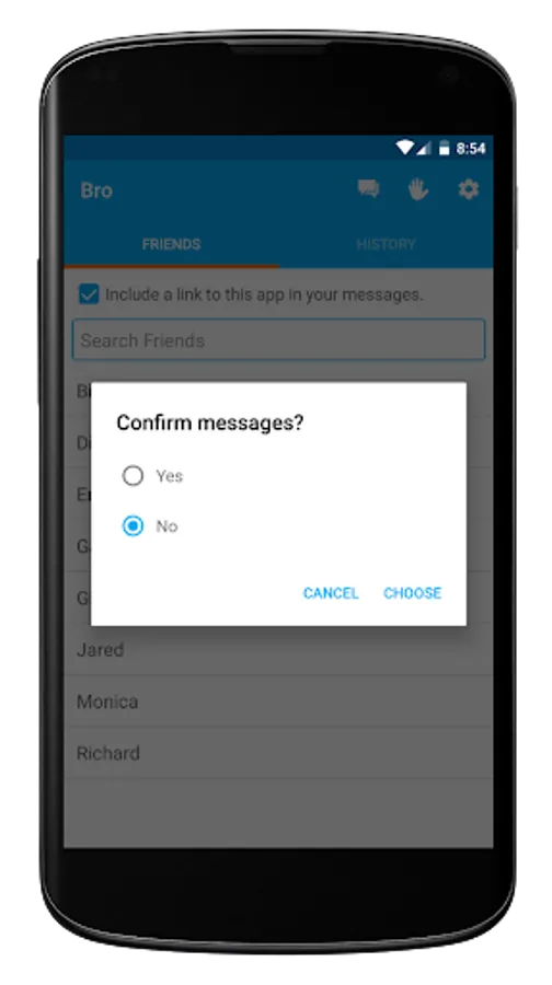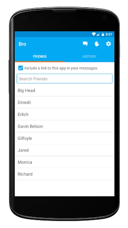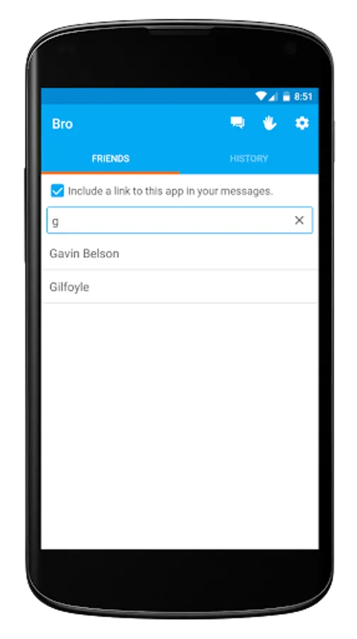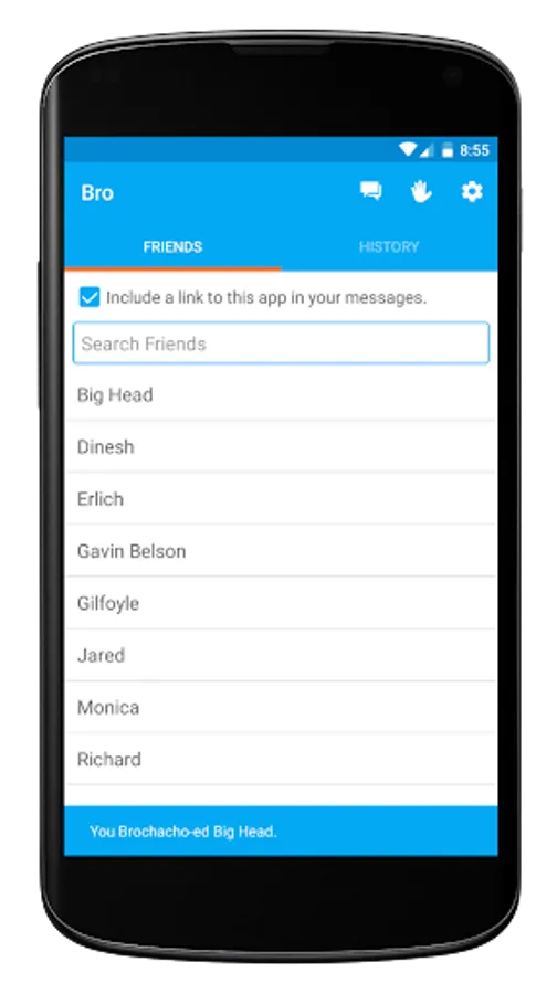 Quickly look through your contacts with the app's dynamic search to find the bro you're looking for. Simply click on them to send them a "Bro".