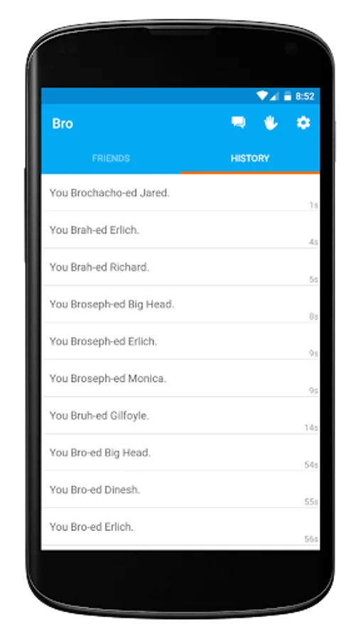 Having trouble keeping track of who you've Bro-ed and who you haven't? Then this app has got you covered. The app keeps a running feed of everyone you've ever Bro-ed along with when you Bro-ed them and what message you Bro-ed them with. Click on any story to delete it or resend its message to its bro.
