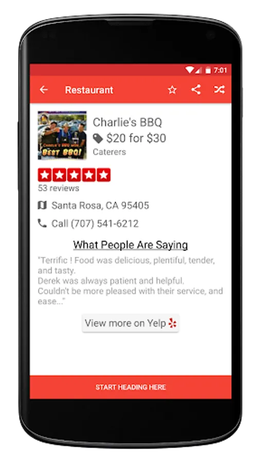 Food Button is designed to streamline the food finding process as much as possible. Hitting the giant red button makes the app grab your current location and find an awesome restaurant nearby in seconds. Click the "Start Heading Here" button on any restaurant page to immediately start navigating there in Google Maps. Everything you want to do is just one click away!