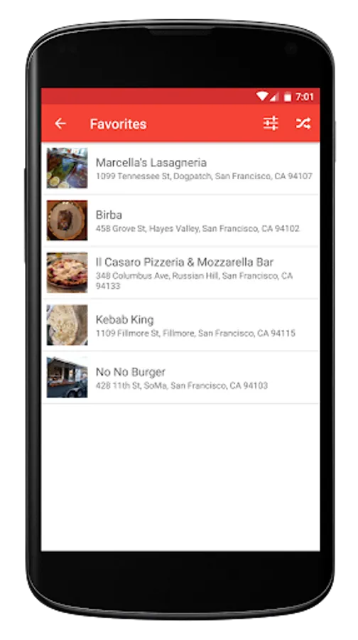 I originally built this app, because my friends and I would often times have trouble deciding on a place to eat. That's why I've included the ability to choose a restaurant randomly wherever possible. You can have the search results be returned to you in a random order from the filter and jump to a random restaurant from both the search results page and your favorites page.