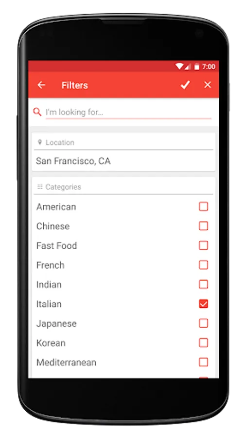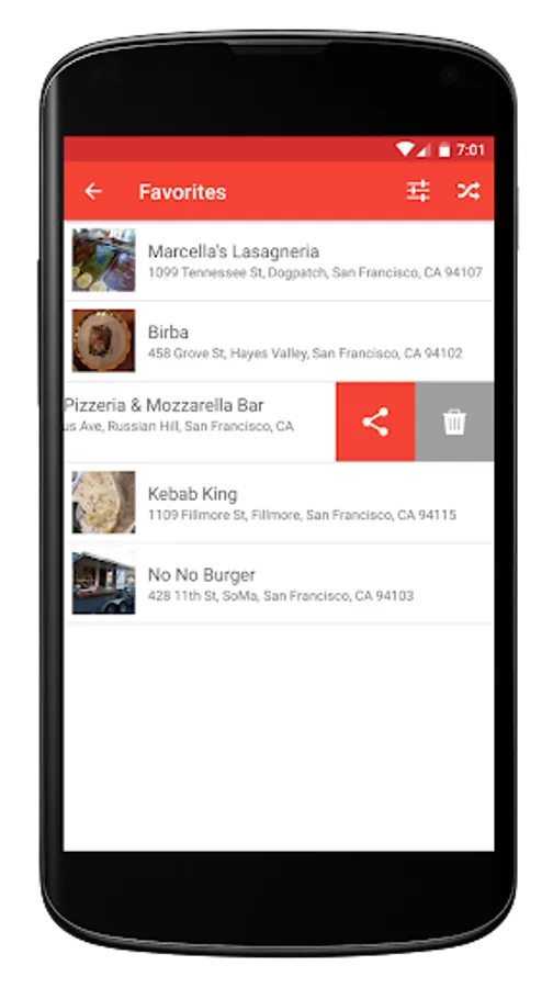 If you find a restaurant you like, simply hit the star in the toolbar to save it to your favorites, which will allow you to view that restaurant's information at all times, even when you're offline. Swipe left on any favorite to quickly share its information or unfavorite it. If you have a lot of favorites and need to sort through them, you can filter them by both category and location.