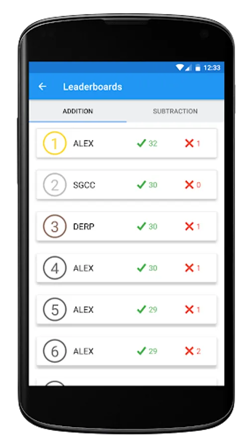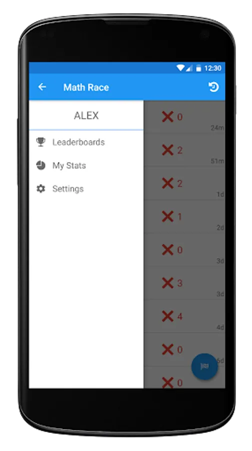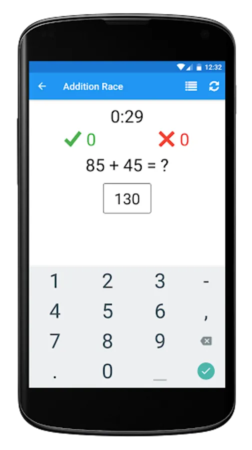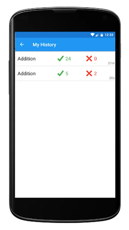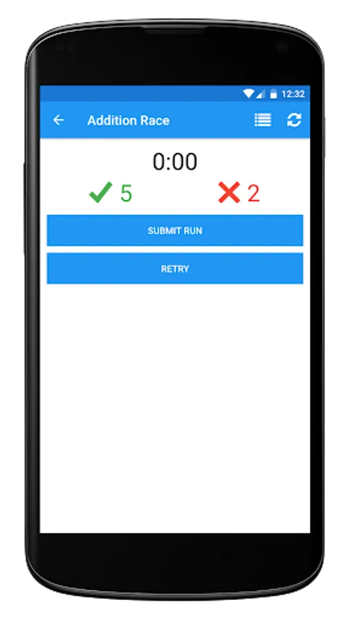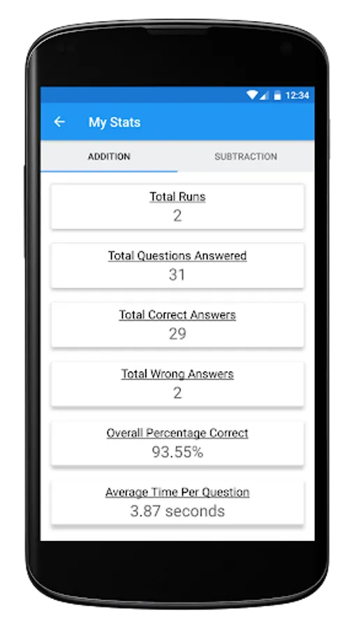 A statistical overview of all your Math Races ever. Want to know the average time in seconds you take per addition question or what your best subtraction run ever is? Don't worry, the Math Race app has got you covered.