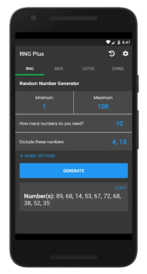 Eyes feeling tired? Then turn on Random Number Generator Plus's dark mode to give the app a darker, less bright color scheme and save your device some battery along the way. You can turn dark mode on or off at any time from the app's settings menu.
