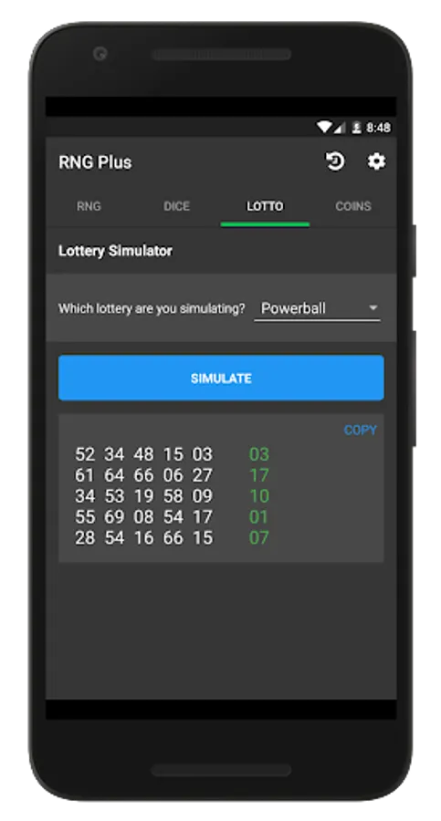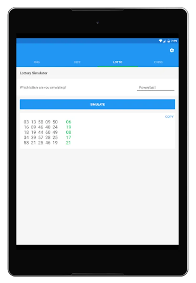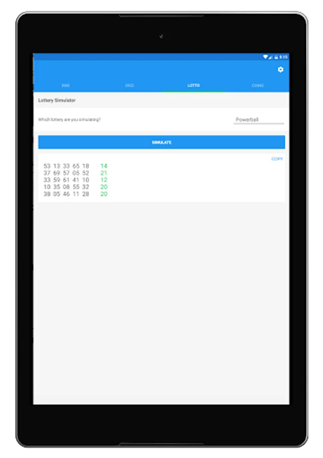 Feeling lucky? Then let's simulate a lottery or two! Generate 5 random lottery tickets/results with the click of a button. You can choose from simulating the Powerball or Mega Millions. Oh yeah, you can also copy the results to your clipboard with a simple click like with any Random Number Generator Plus feature.