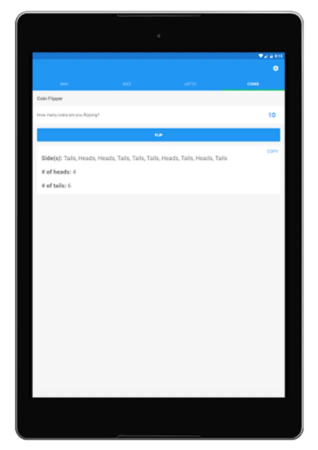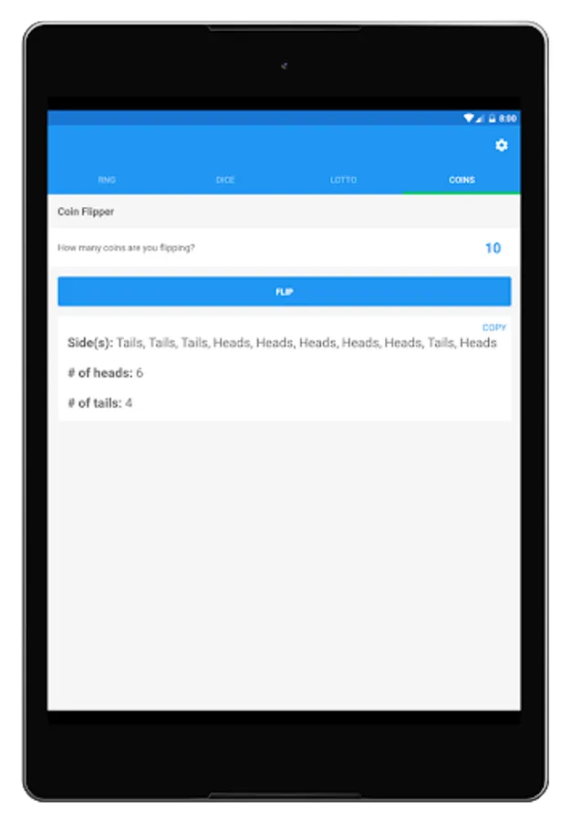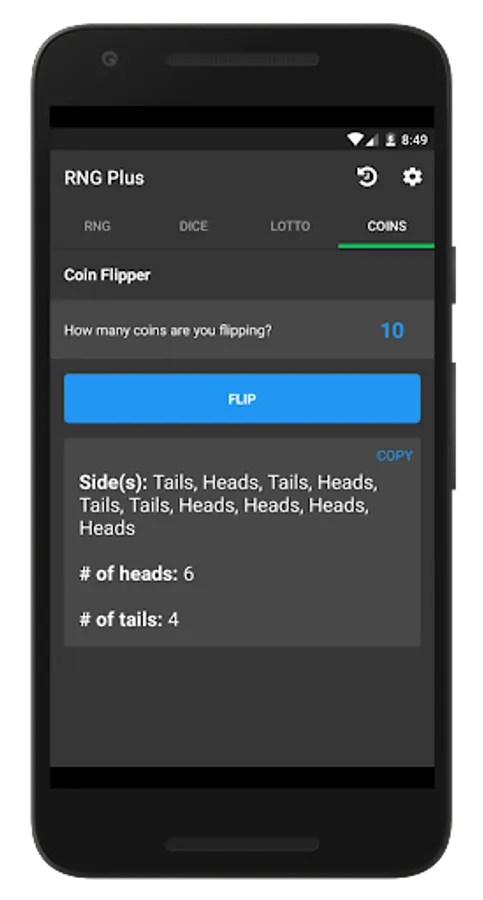 Need to quickly settle a 50/50 bet? Then use Random Number Generator Plus to flip a coin for you! Flip as many coins as you want whenever you want. The app also saves your preferred number of coins to flip for quick reuse and sums up the # of heads flipped and the # of tails flipped for you in the results box as well. And yep, you can copy to clipboard these results too.