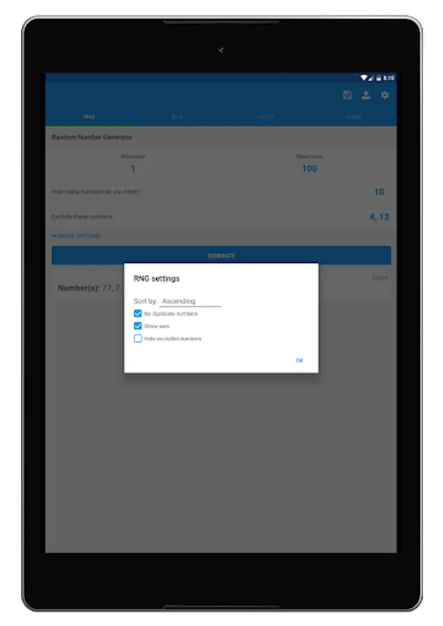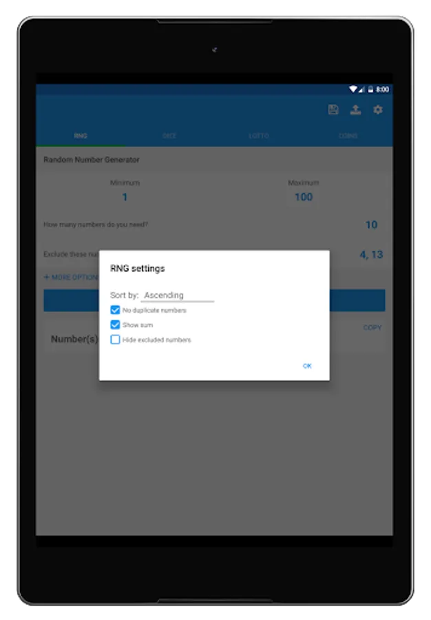 With the default random number generator, you can customize the amount of numbers you want alongside the range you want them to be from. You can also exclude specific numbers, sort the results by ascending or descending order, show the sum of the generated numbers, and copy the generated numbers report to your clipboard for easy sharing and transferring.