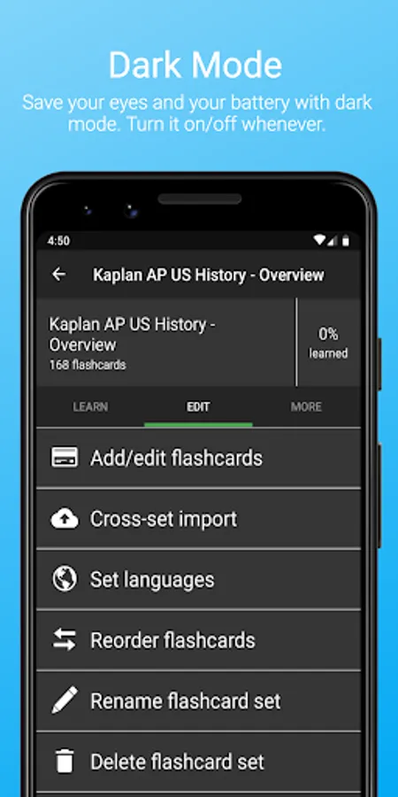 - Import flashcard sets from .csv files, so you don't need to create flashcards in-app. Export them as .csv files to study them on your computer.
