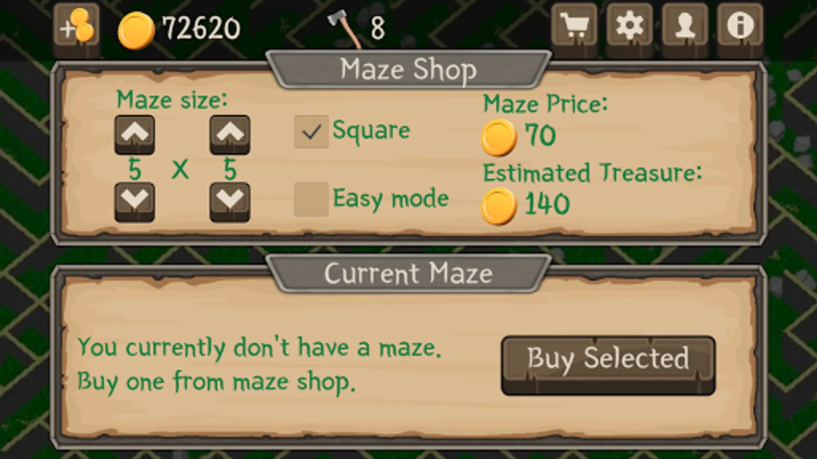 You can buy a maze of size you select, from maze shop with your golds. Bigger mazes cost more gold and are more difficult to solve, but pay more gold as well, when they are solved.