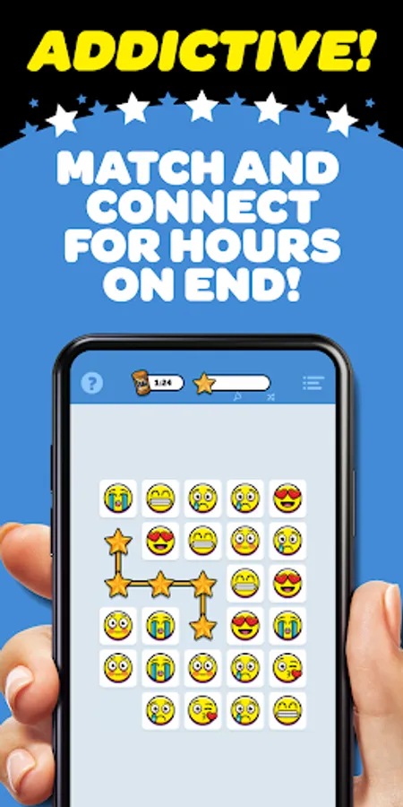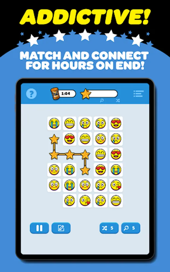 As each level begins you are presented with a fun mix of 🚀 images, 🗽 icons, and 😆 emojis on the game board. These tiles appear in random grids, or patterns, or sometimes just a square box. Your challenge is to search through the icons and find a pair of tiles that match, (they can be next to each other OR around a corner across the board). Once you have found two matches, next you have to find a connecting path between the pair of matching tiles in 3 straight lines or less, utilizing only two 90 degree turns around corners if another tile is blocking your connection path.