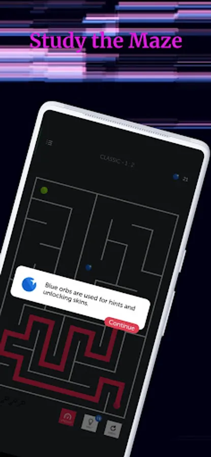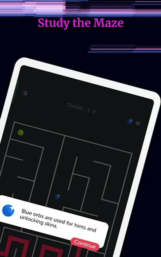 🟡 ORBS - As you play be sure to collect orbs! These little fellas show up randomly throughout mazes. Collect them as you play to build up your bank, and use the orbs for hints and other prizes, such as new skins and colors! Watch a short video to add a multiplier and get even MORE orbs. They add up, so don’t forget to collect as many as you can find!