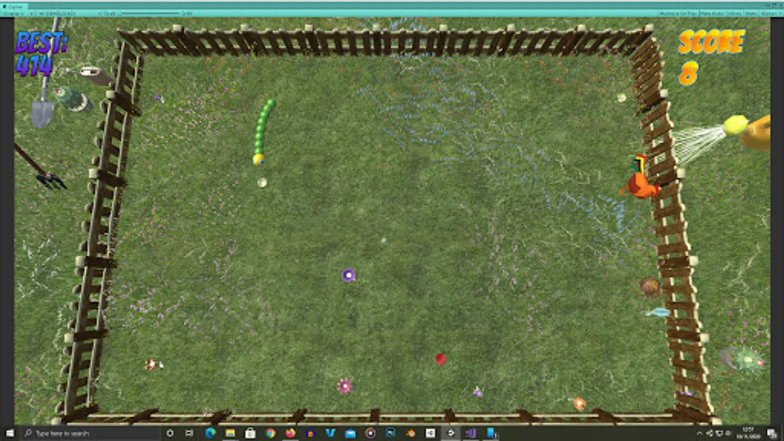 Move around the field and eat food to grow, but be careful and don't hit your tail as it grows.