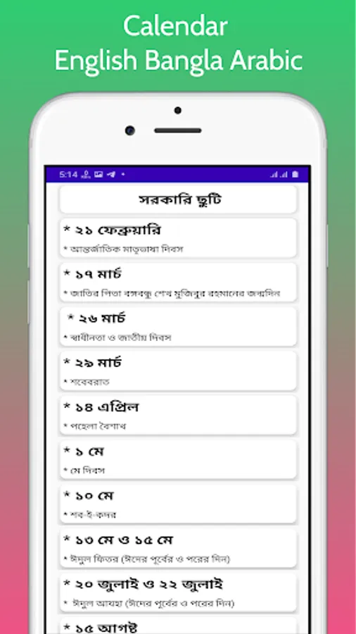 এই অ্যাপটি হচ্ছে ইংরেজি বাংলা আরবি ক্যালেন্ডার। এই ক্যালেন্ডারে আপনারা একসাথে পাবেন বাংলা ইংরেজি আরবি ক্যালেন্ডার। বাংলা ইংরেজি আরবি ক্যালেন্ডার যারা খুজছেন তাদের জন্য।