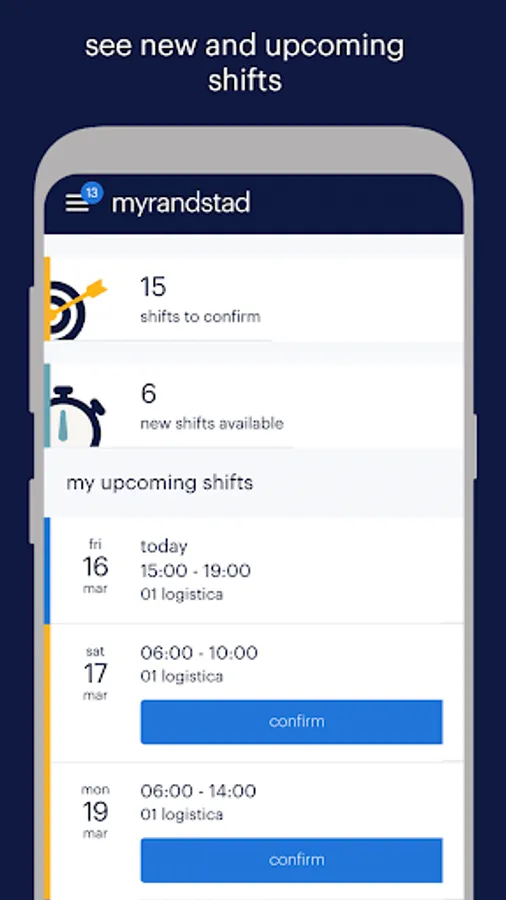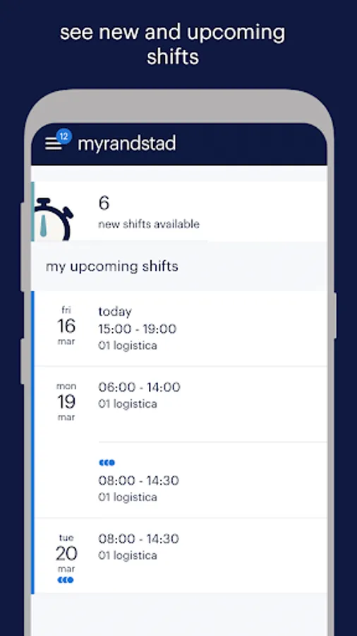 Myrandstad provides a clear overview of your workforce schedule and support you with efficient communication with Randstad. Easily upload your availability and accept your shifts whenever it suits you.