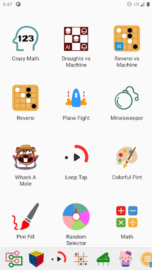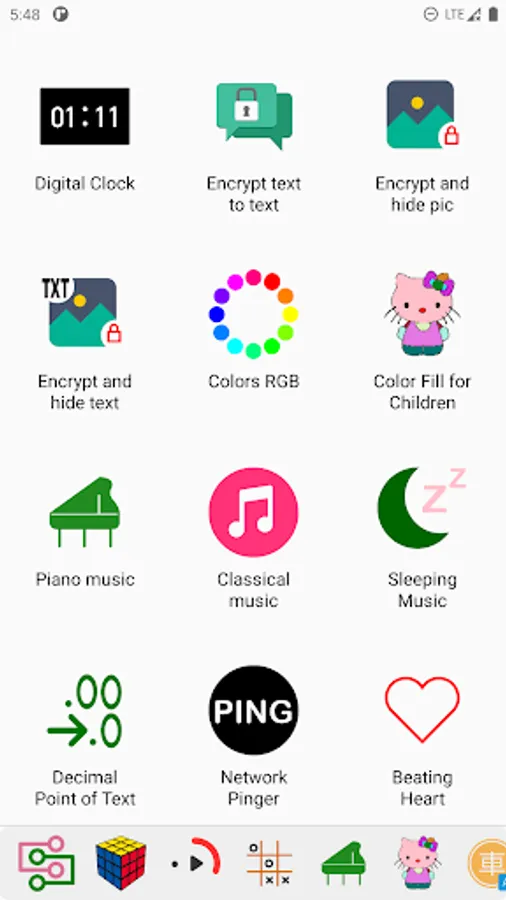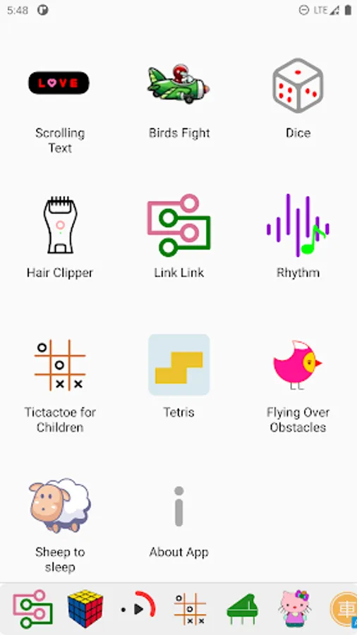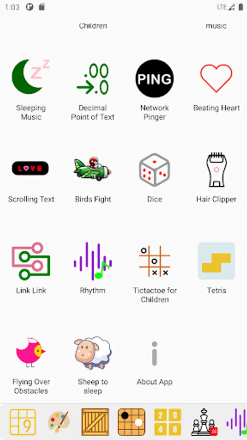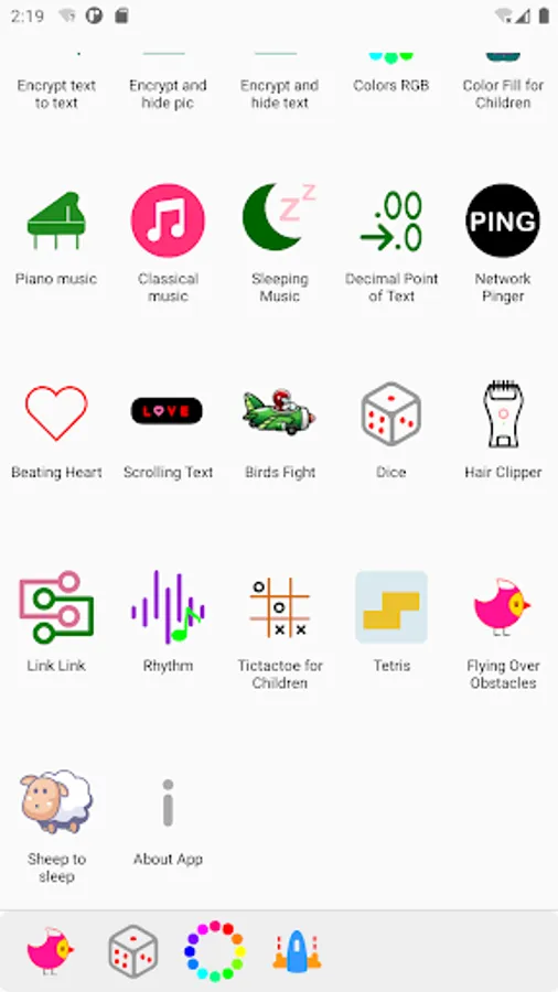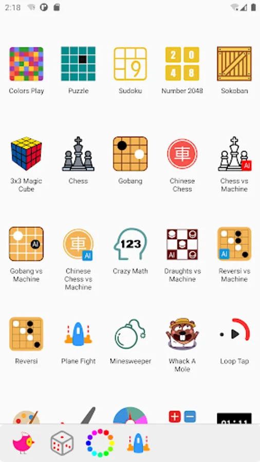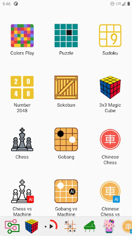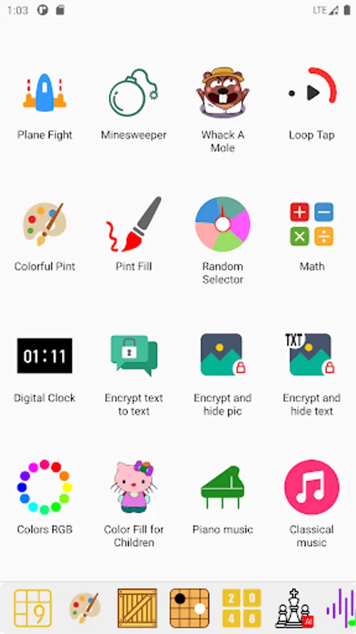 Many interesting Apps Set, include Colors Play, Puzzle, Sudoku, Number 2048, Sokoban, Rubik's Cube, Chess, Gobang, Chinese Chess, Grazy Math, Draughts, Reversi, Plane Fight, Minesweeper, Whack A Mole, Loop Tap, Colorful Pint, Pint Fill, Random Selector, Math, Digital Clock, Encrypt Text, Encrypt Pic, Colors RGB, Color Fill for Children, Piano music, Scrolling Text, Birds Fight, Dice, Link Link, Rhythm, Tictactoe, Tetris, Flying.