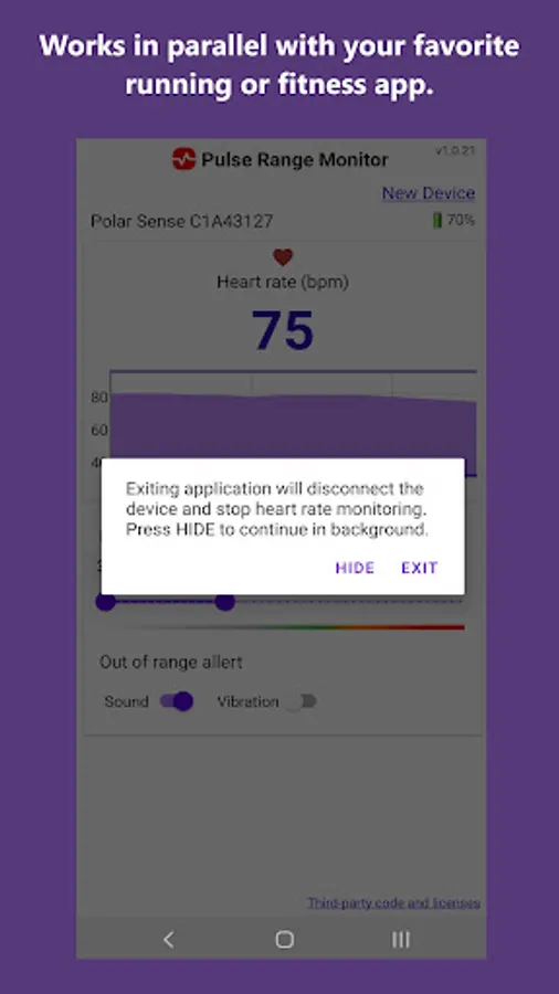 You can continue training with your favourite running or fitness app, mobile version of Pulse Range Monitor runs parallel in the background. Please turn on "2 bluetooth devices" in device settings if needed. When working in the background, the mobile app displays a corresponding notification.