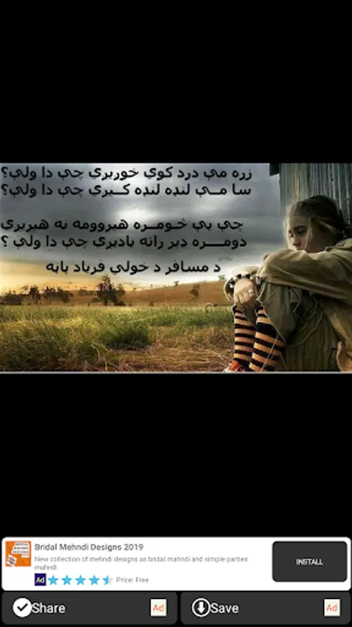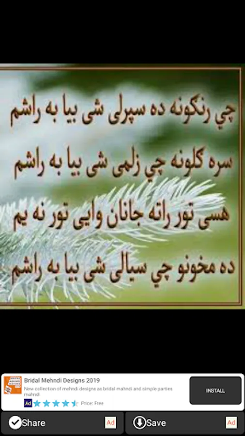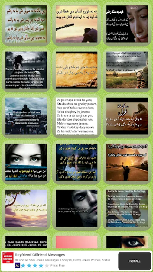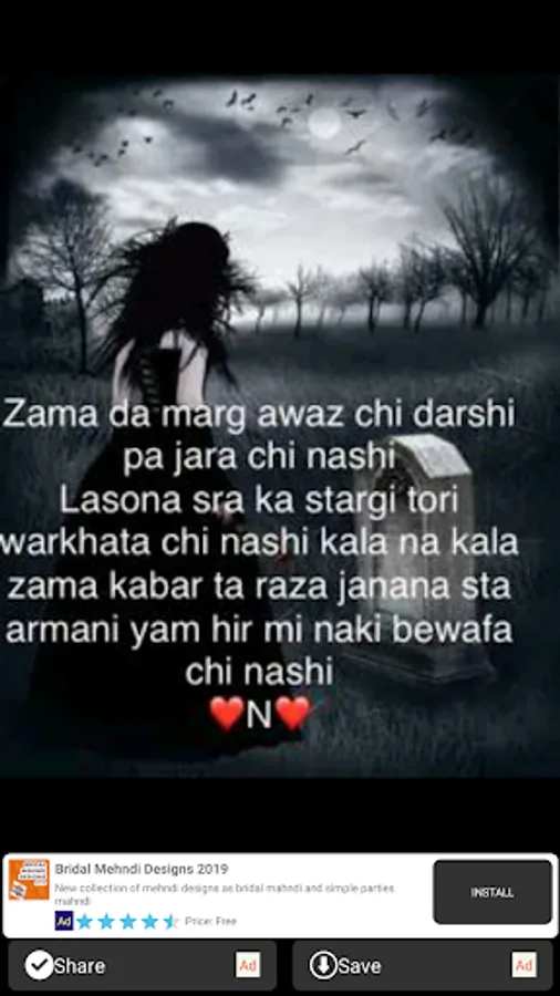 Pashto sherona , nazam ghazal collection. Pashto SMS and status collection. Rehman baba kalam and gul purna collection. Pashto tappay mahiya geet collection. Nadia iqbal shairi.