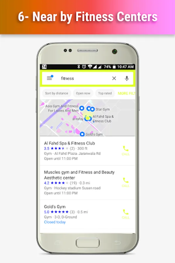 It this section you can find nearby Fitness centers, Gym and Health centers. You'll also get the directions to the Fitness center, gym or health center.