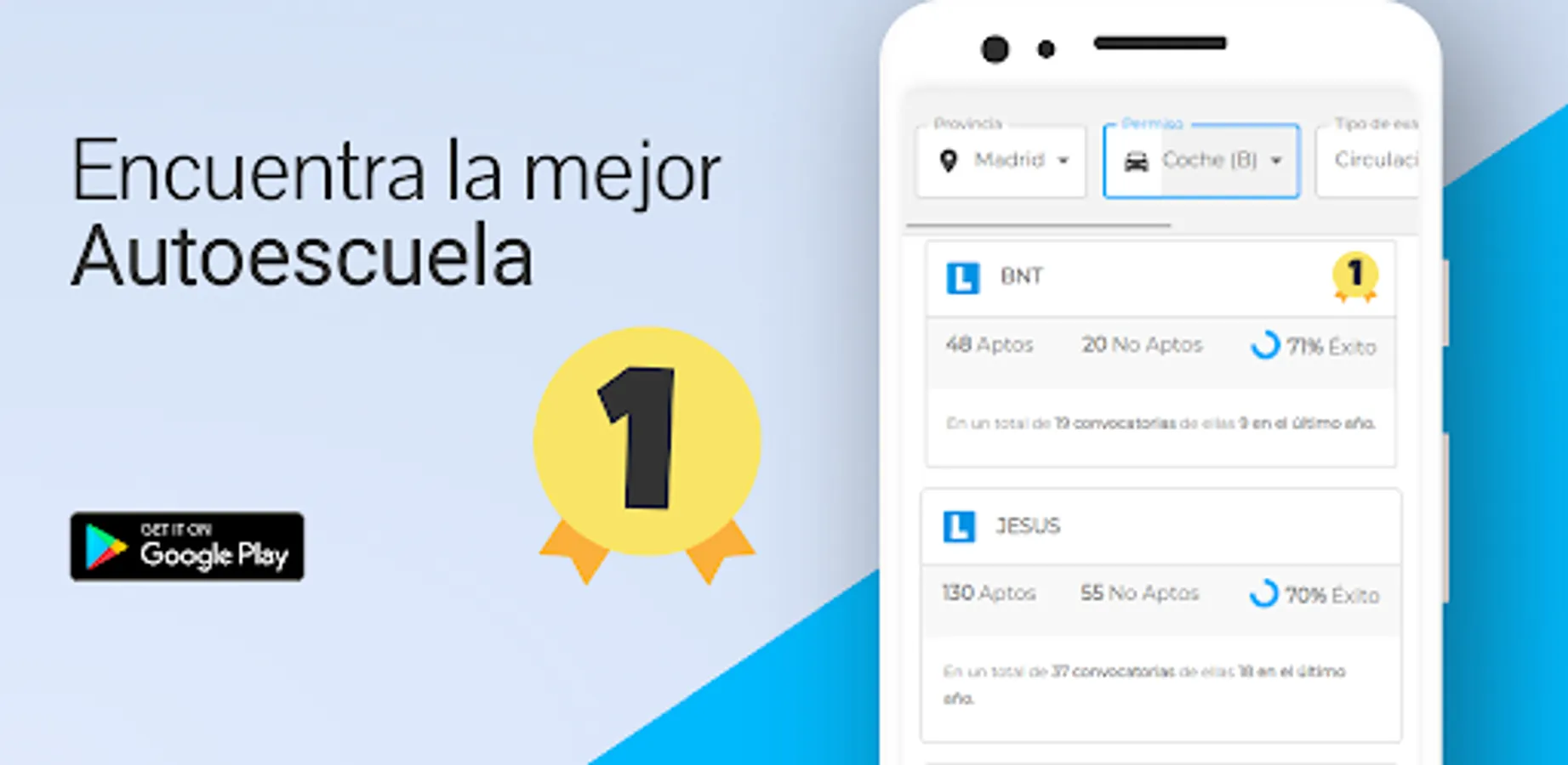 Gracias a los filtros podrás conocer la cantidad de usuarios que aprueban y suspenden para una determinada autoescuela. Usa el buscador para encontrar tu autoescuelas más cercanas y compáralas!