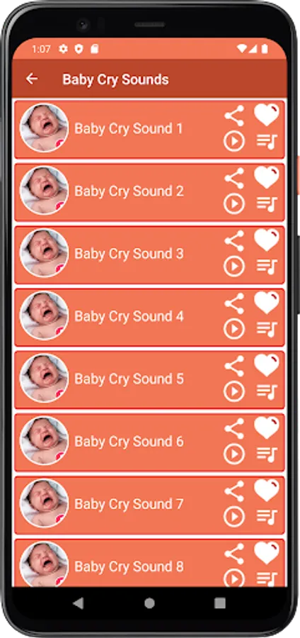 This application containing the best collection of baby cry sounds for android devices. Sounds have been selected very carefully to be a good and fun user experience, we hope you will enjoy using the app and listening to baby cry sounds.