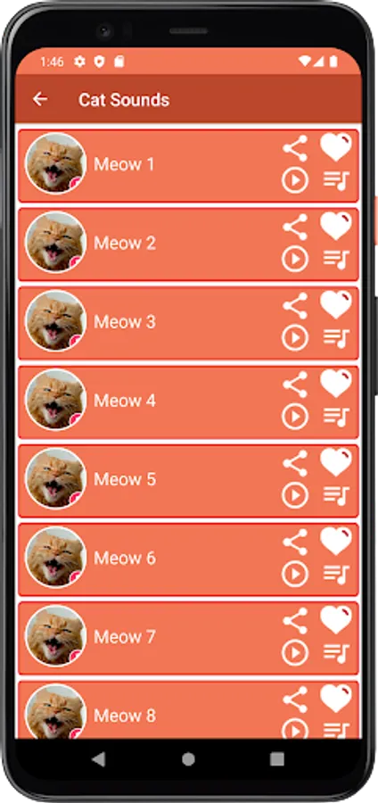 This application containing the best collection of cat sounds for android devices. Sounds have been selected very carefully to be a good and fun user experience, we hope you will enjoy using the app and listening to cat sounds.