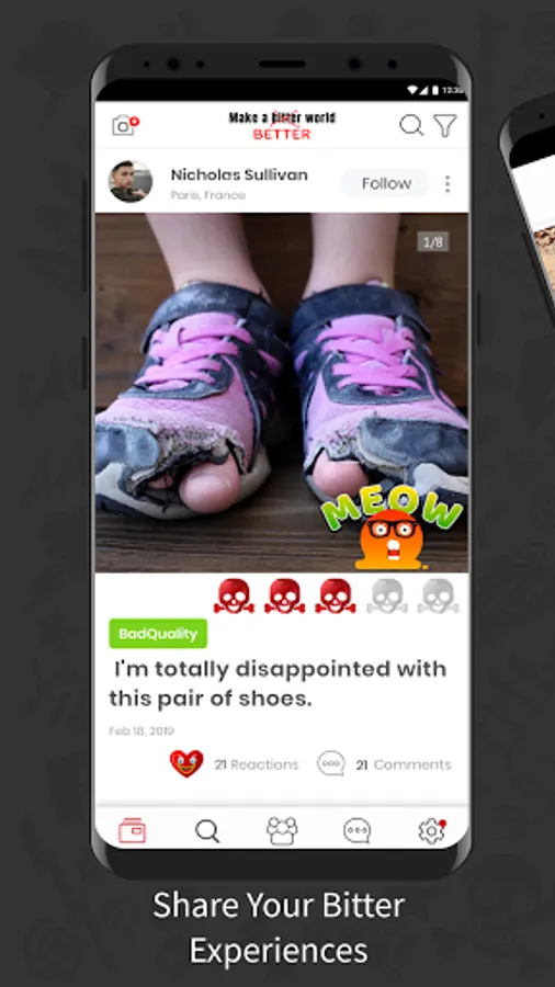 Life isn’t always smooth sailing. Sometimes restaurants are awful, your car won’t start, your boyfriend is lazy, and your new shoes fall apart, but don’t worry you’re not alone! Life isn’t ALL rosy Insta posts! That’s why we created BitterWorld so you can share your TRUE feelings about an experience with others who are struggling - just like you.