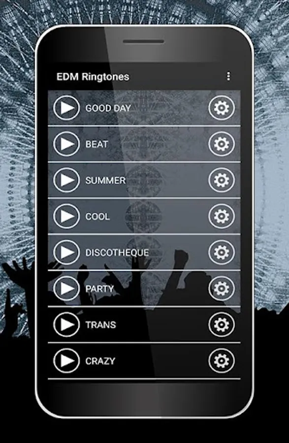 Feed your phone with the best electronic dance ringtones and sounds! They are easy to use and completely free. Beautiful interface and loud and clear sounds are making this app perfect for all people who are searching for quality and fun ringtones. So wait no more and enjoy top collection of EDM ringtones. It was never easier to personalize your phone just like you want. Simply press the play button to preview one of the high quality melodies and sounds. When you find the perfect one, press the settings button and set it as a ringtone, notification or alarm. Download them now and enjoy top ringtones for free! Be unique and have the best high quality party songs and dance melodies on your phone. We made the best remix sounds and ringtones for android for all electro music lovers. Let everybody hear electro rhythm from your phone and make a personal dance floor!