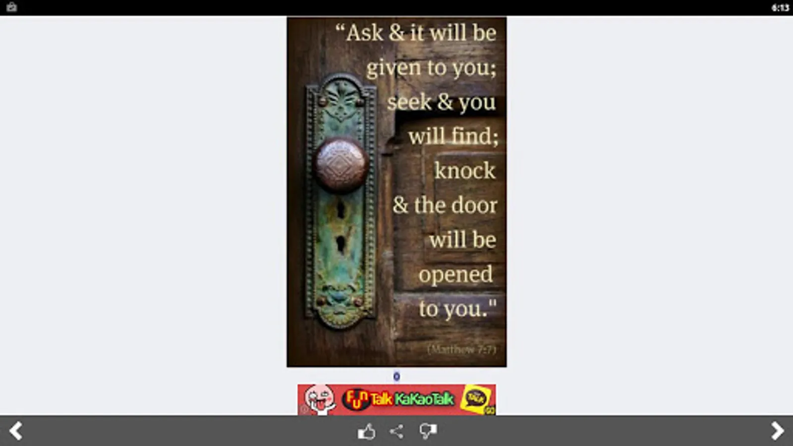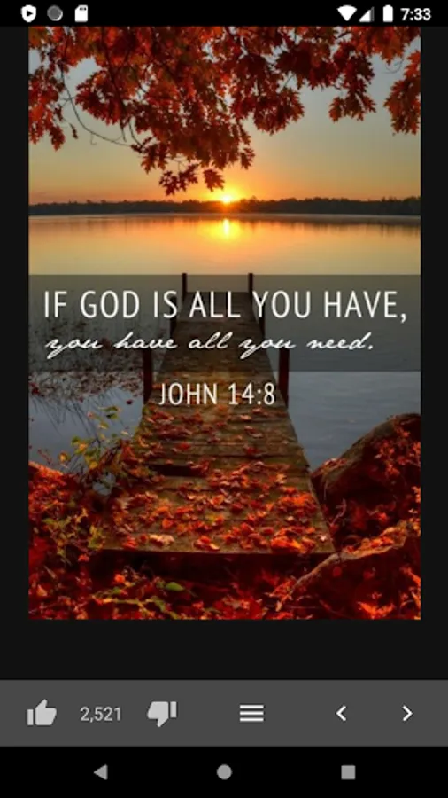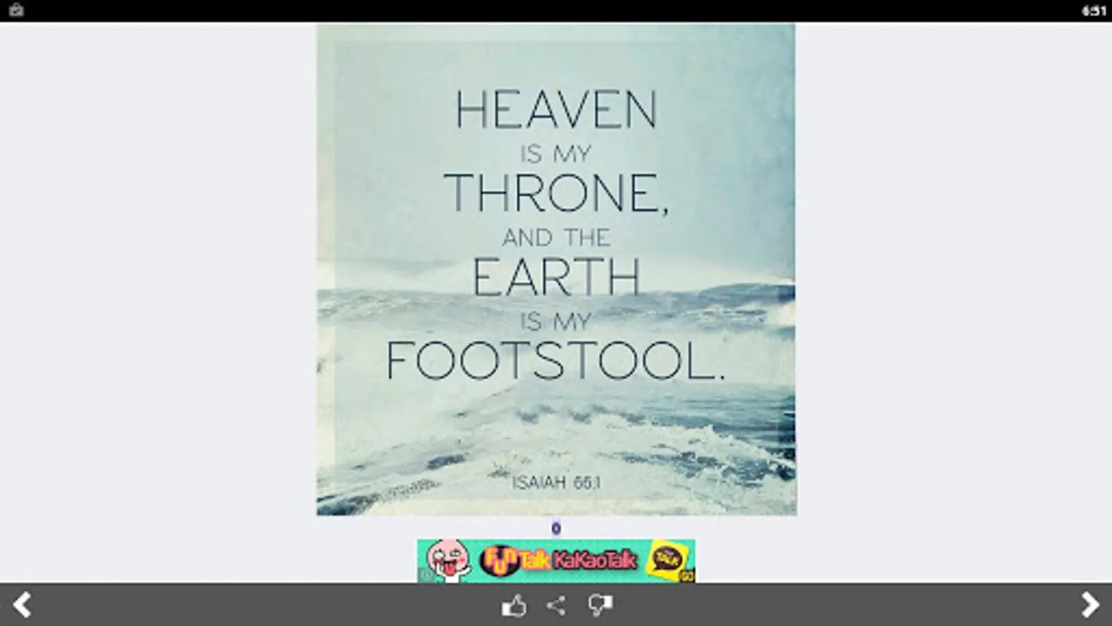 The navigation in Bible Daily Quotes is really simple, first you will be shown gallery of pictures(daily updated), then you can click each pictures. From there, you will be able to zoom each pictures by pinching, rate the picture, save the image, and share the quotes.