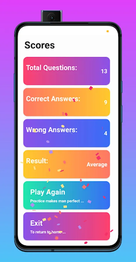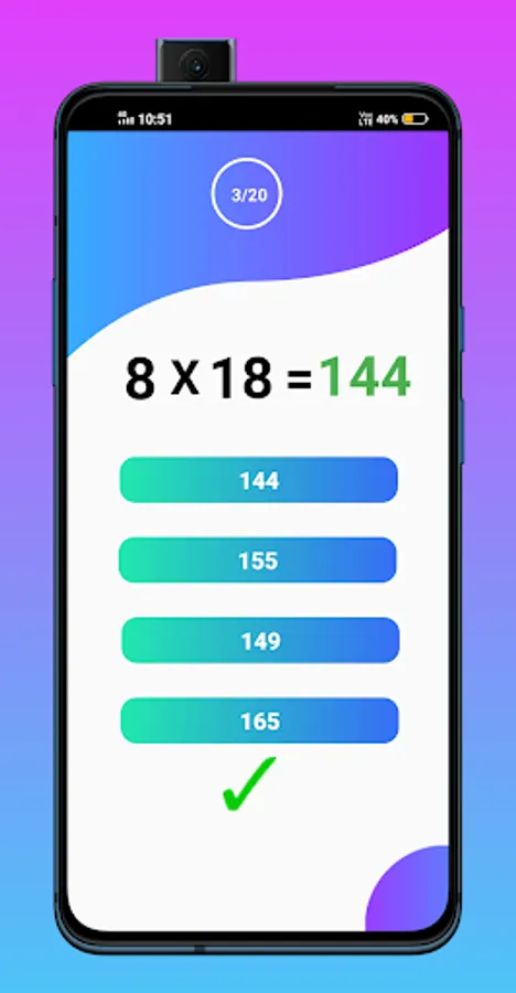 The practice of maths tables by this app can be done with 3 - Levels like:- Easy, Medium, Hard, and then the result is shown on the screen, thus regular practicing of the maths tables will make you a champ at it.