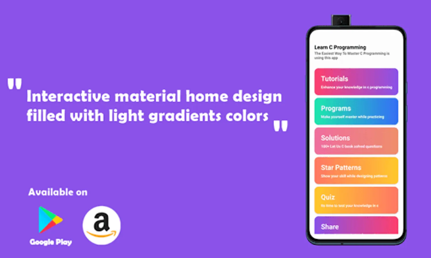 This Learn C Programming app has a really simple and intuitive user interface filled with light gradients colors. The app is really attractive due to its material and colorful design.