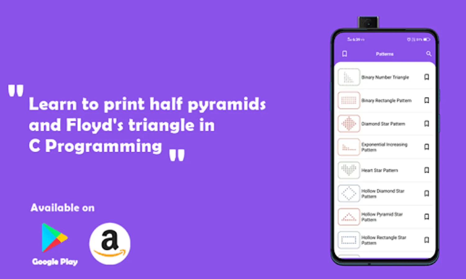 Learn C Programming app contains both section i.e Programs and Star Patterns, programs will help you to learn the C programming concepts as well as printing star patterns will