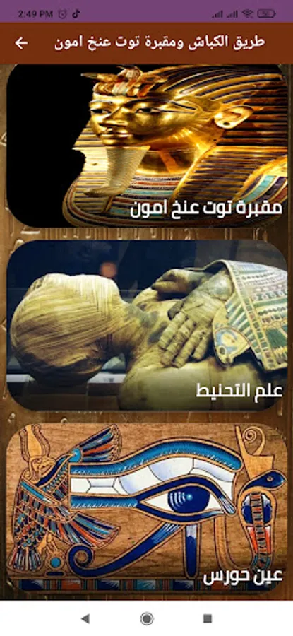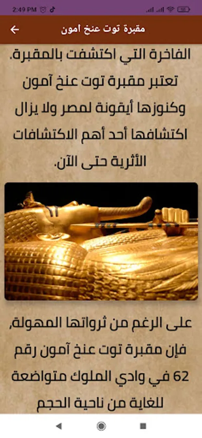 The application of the Road of Rams and the Tomb of Tutankhamun also contains information about the tomb of the young king Tutankhamun, which contains great wealth and treasures. It also contains the funeral mask of Tutankhamun of pure gold and studded with precious stones.