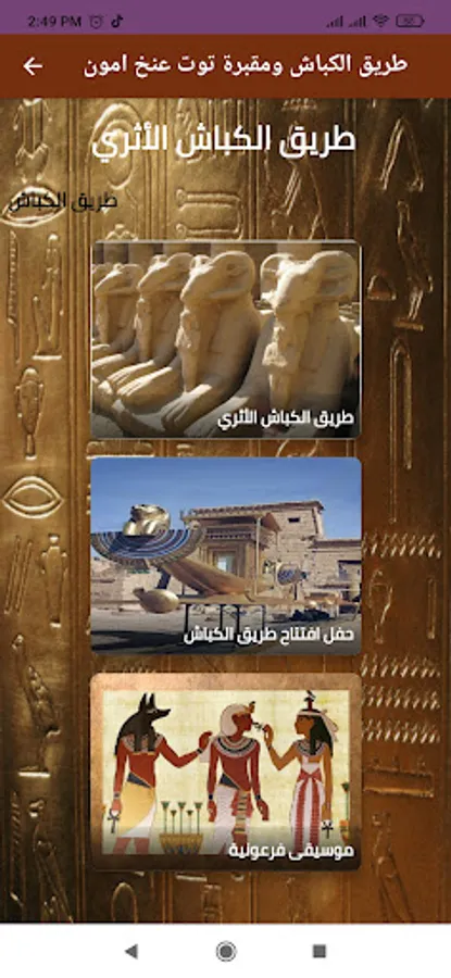 The application of Rams Road and the tomb of Tutankhamun includes the details of the opening of the archaeological rams road located in the international city of Luxor, the parade by sailboats on the Luxor Nile, and the various parades inside the courtyard of the Luxor Temple. The opening of Rams Road coincides with the commemoration of the discovery of the tomb of Tutankhamun and the National Day of Luxor Governorate.