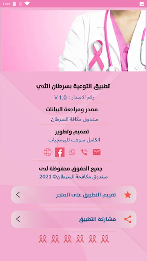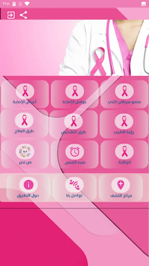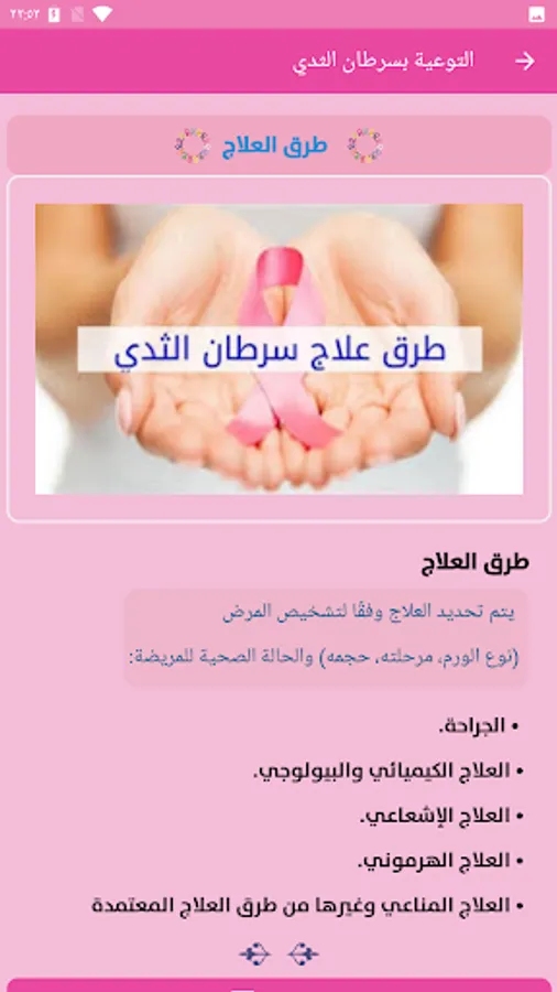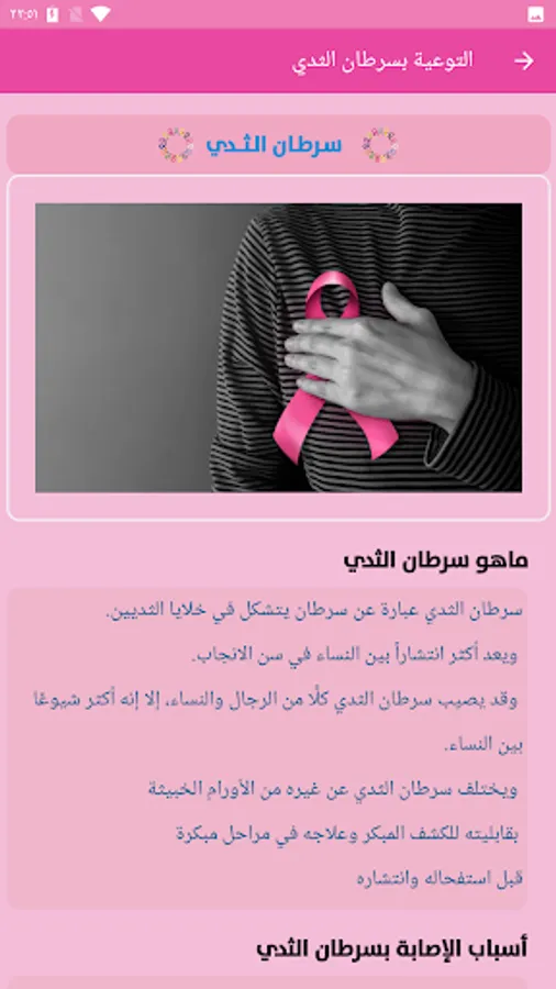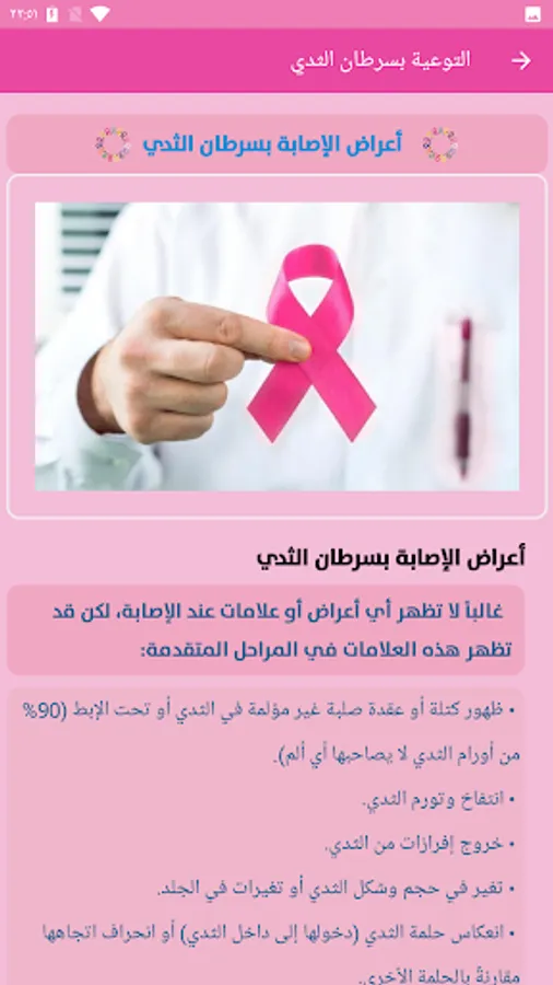 The breast cancer awareness application contains an overview of breast cancer, catalysts for breast cancer, symptoms of breast cancer, and methods of diagnosing breast cancer.