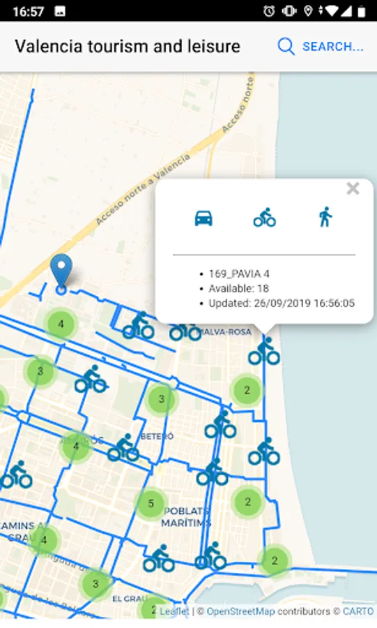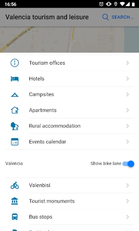 Similarly, get instantly the location and information of monuments and tourist buildings, bike lanes, Valenbisi stations, bus stops and parking lots in the city of Valencia.