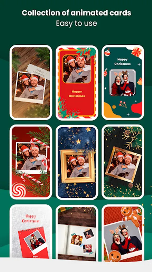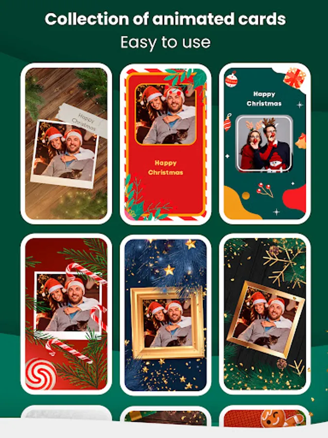 We offer you different Christmas ecards with free animated Santa Claus templates. Everything you need to create stunning stories is here. Find beautifully designed animated greetings and share with your friends. Greeting cards maker app is packed with stickers, templates, and animated videos to help you create high-quality stories content. Our video editing features are simple and can help you create video collages and add text and turn your photos into gif video with just one click!